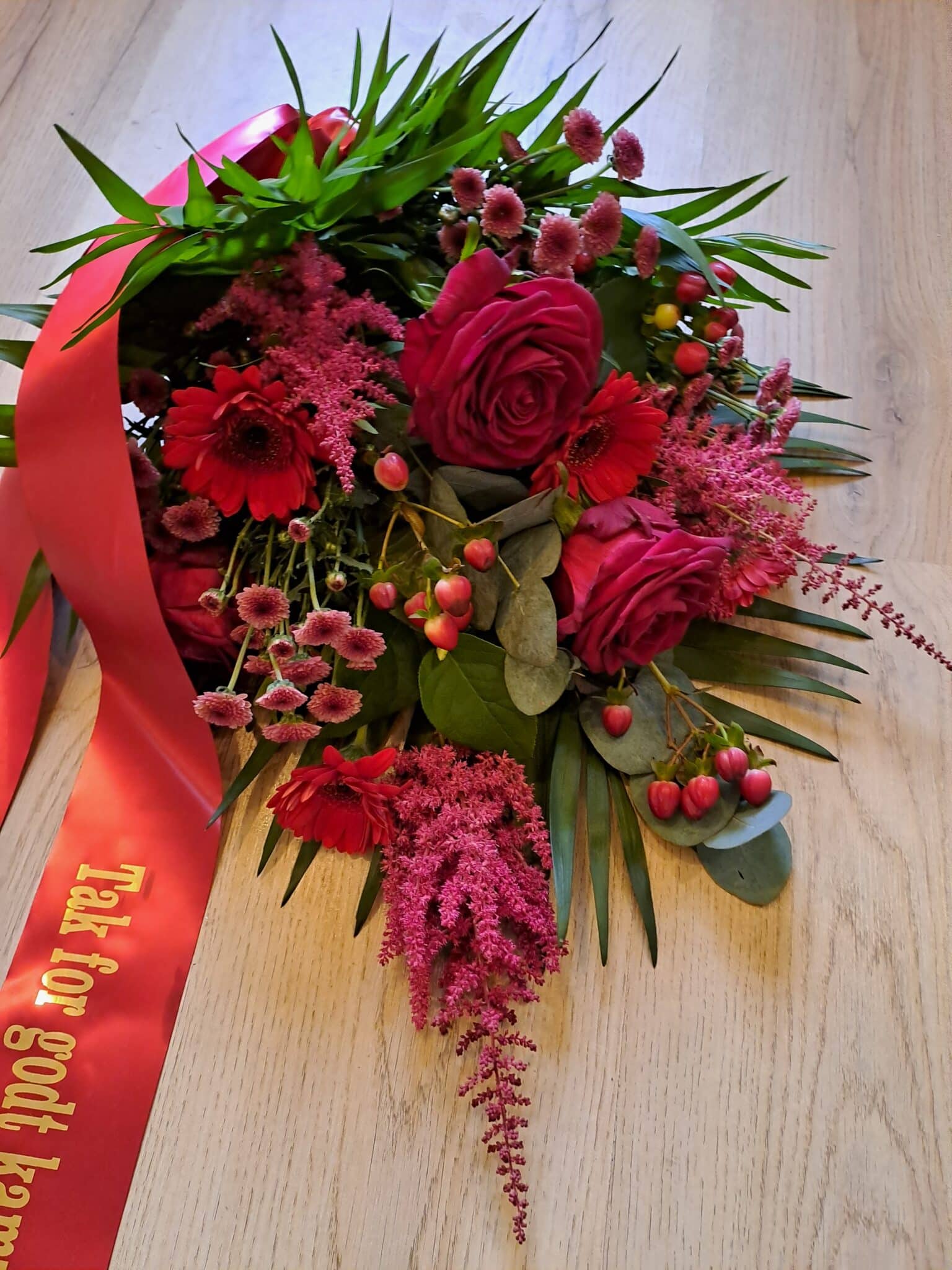 Der tages forbehold for at billedet, er et eksempel. Udtryk og blomstervalg kan varierer, alt efter årstiden og blomstersortiment.
