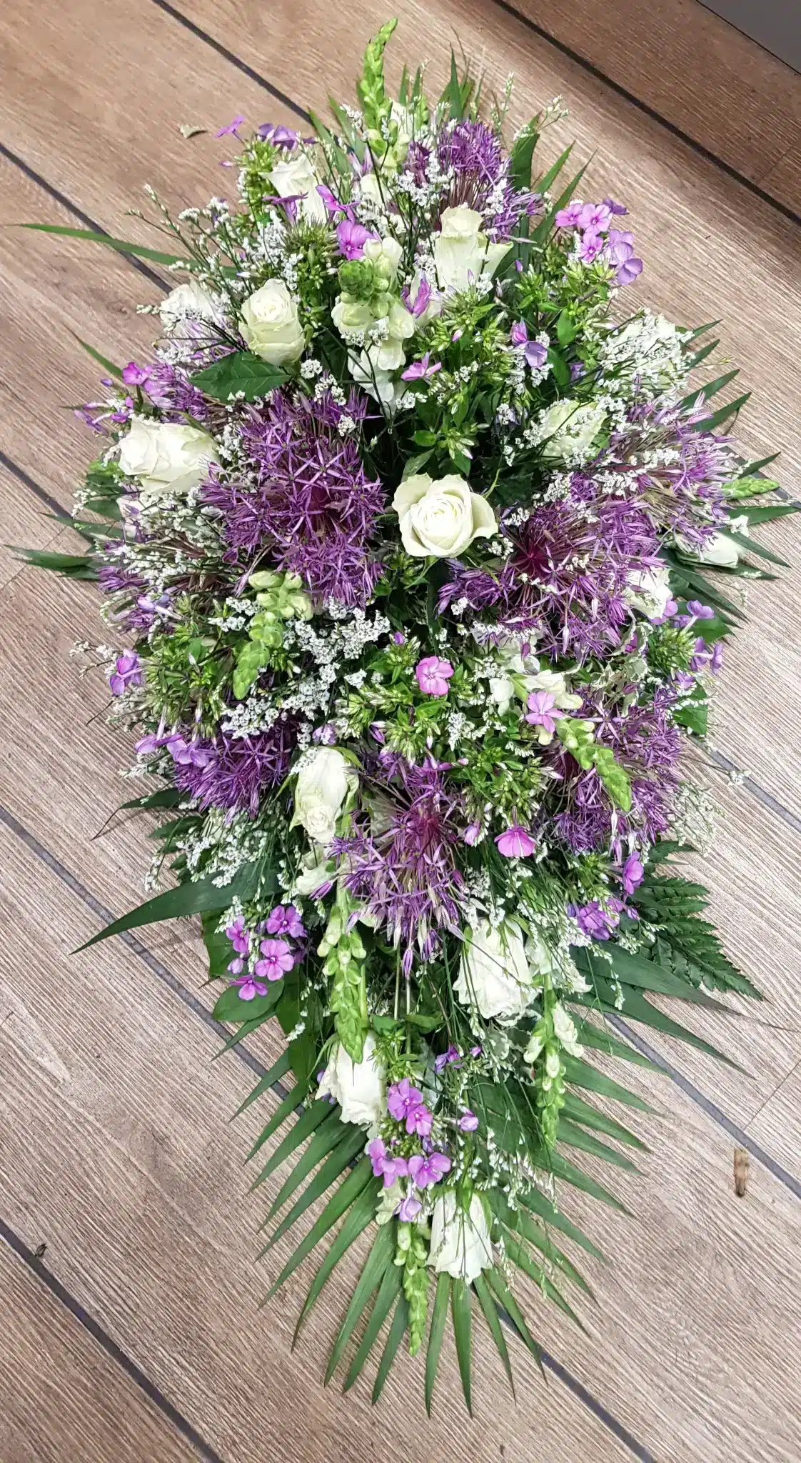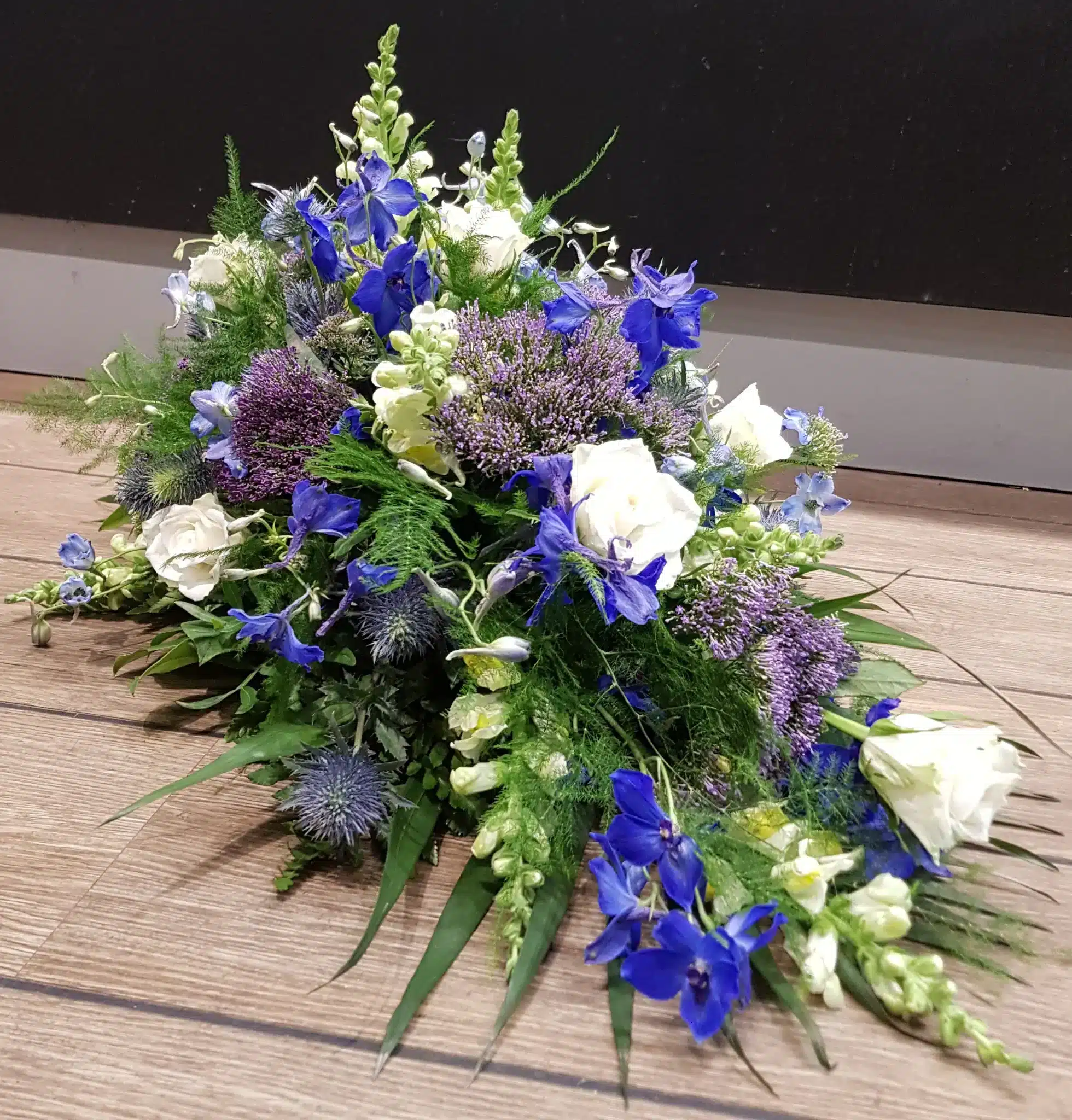 Blomsterdekoratøren udvælger farver og blomster, og sammensætter en smuk båredekoration. Udtryk og blomstervalg kan varierer, alt efter årstiden og blomstersortiment.