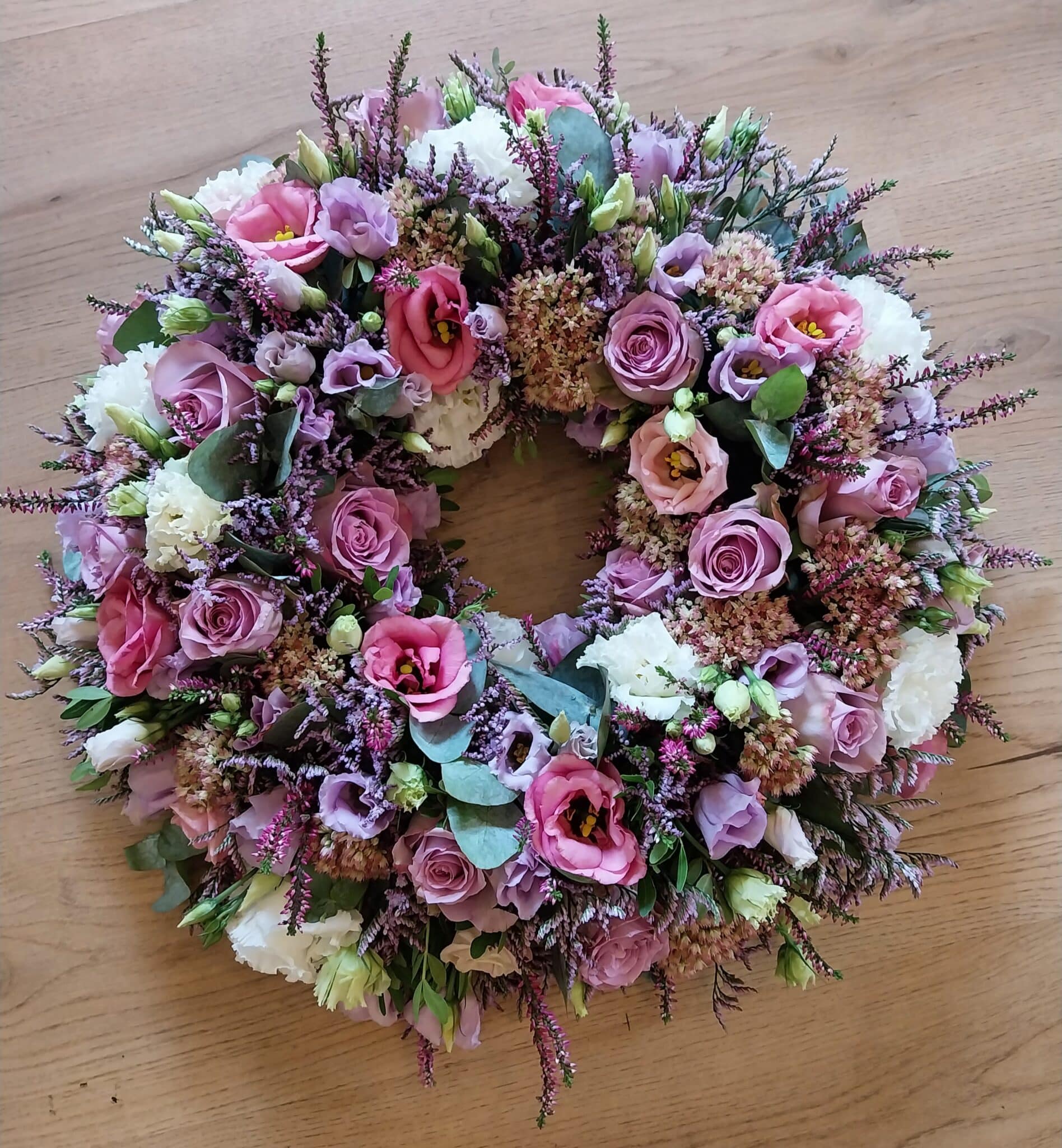 Blomsterdekoratøren udvælger farver og blomster, og skaber en smuk rundpyntet krans.
