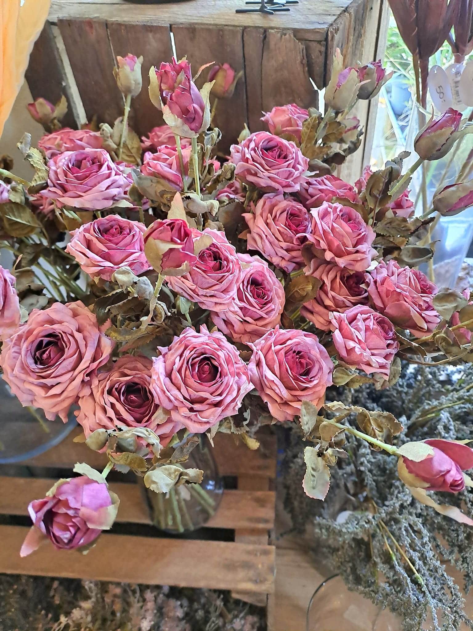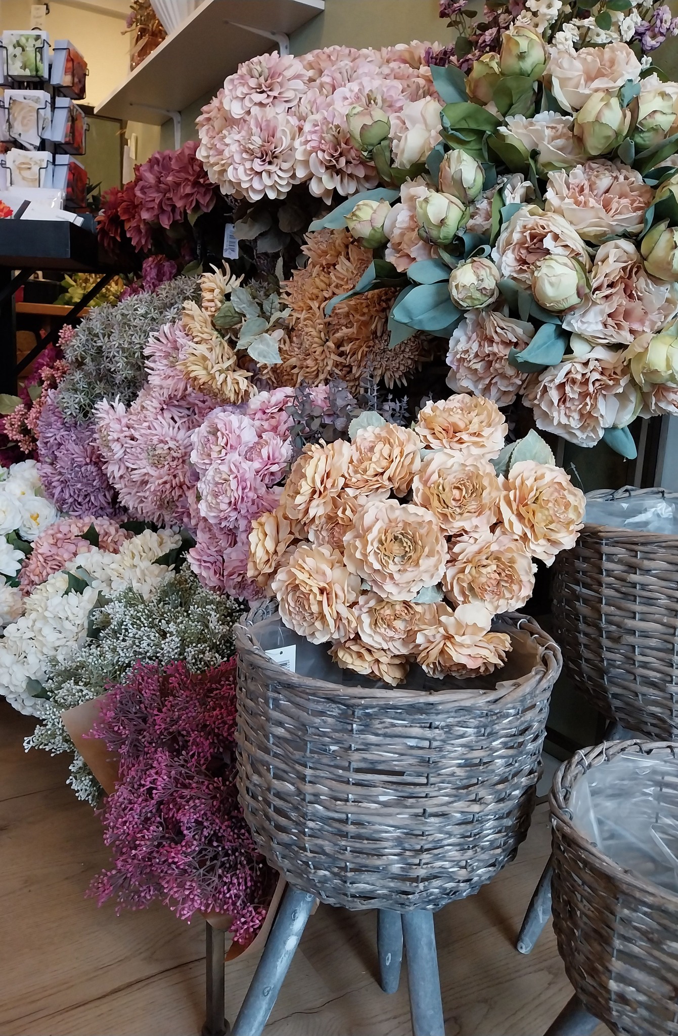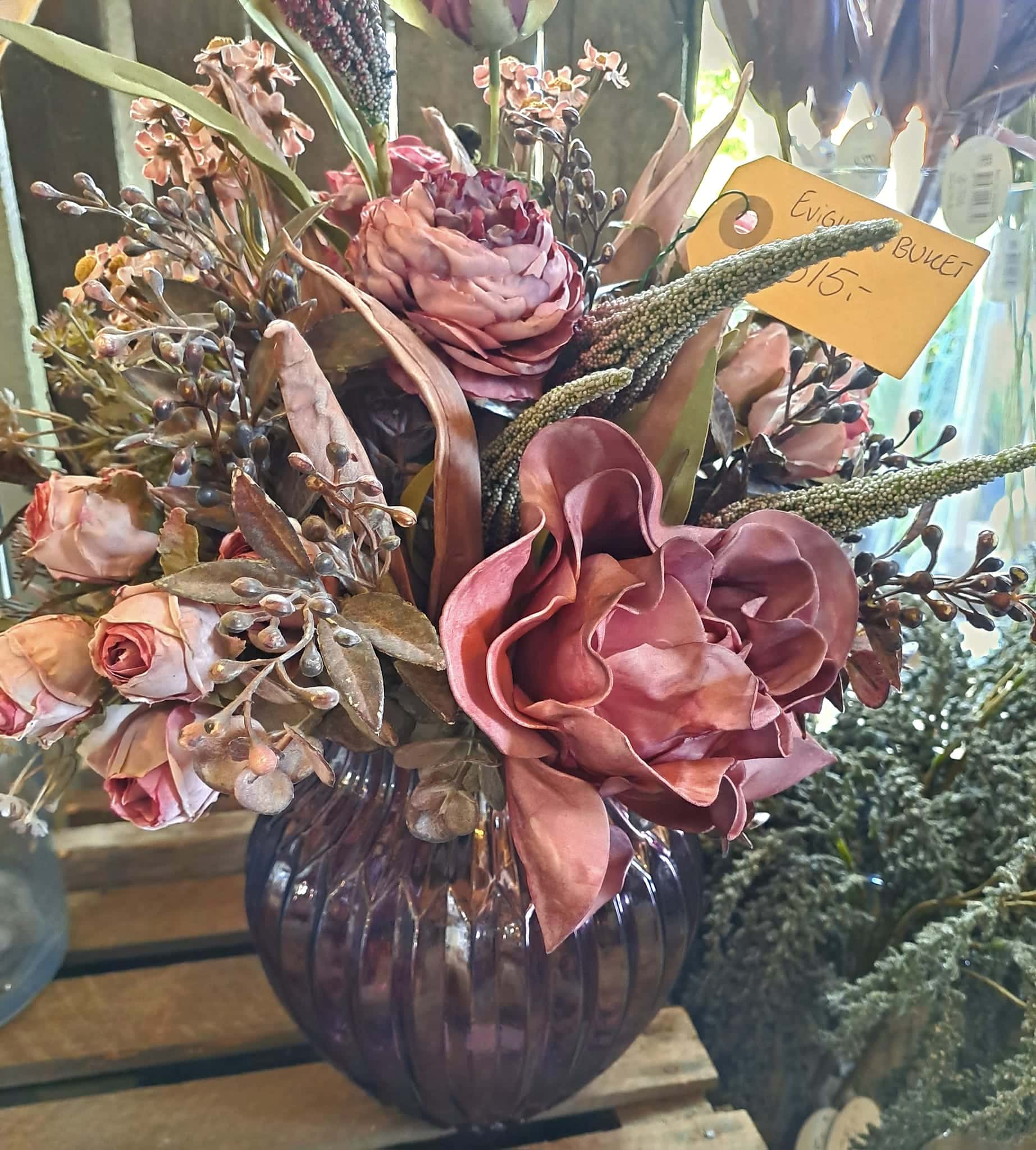 Flot og naturtro buket bundet af silkeblomster.