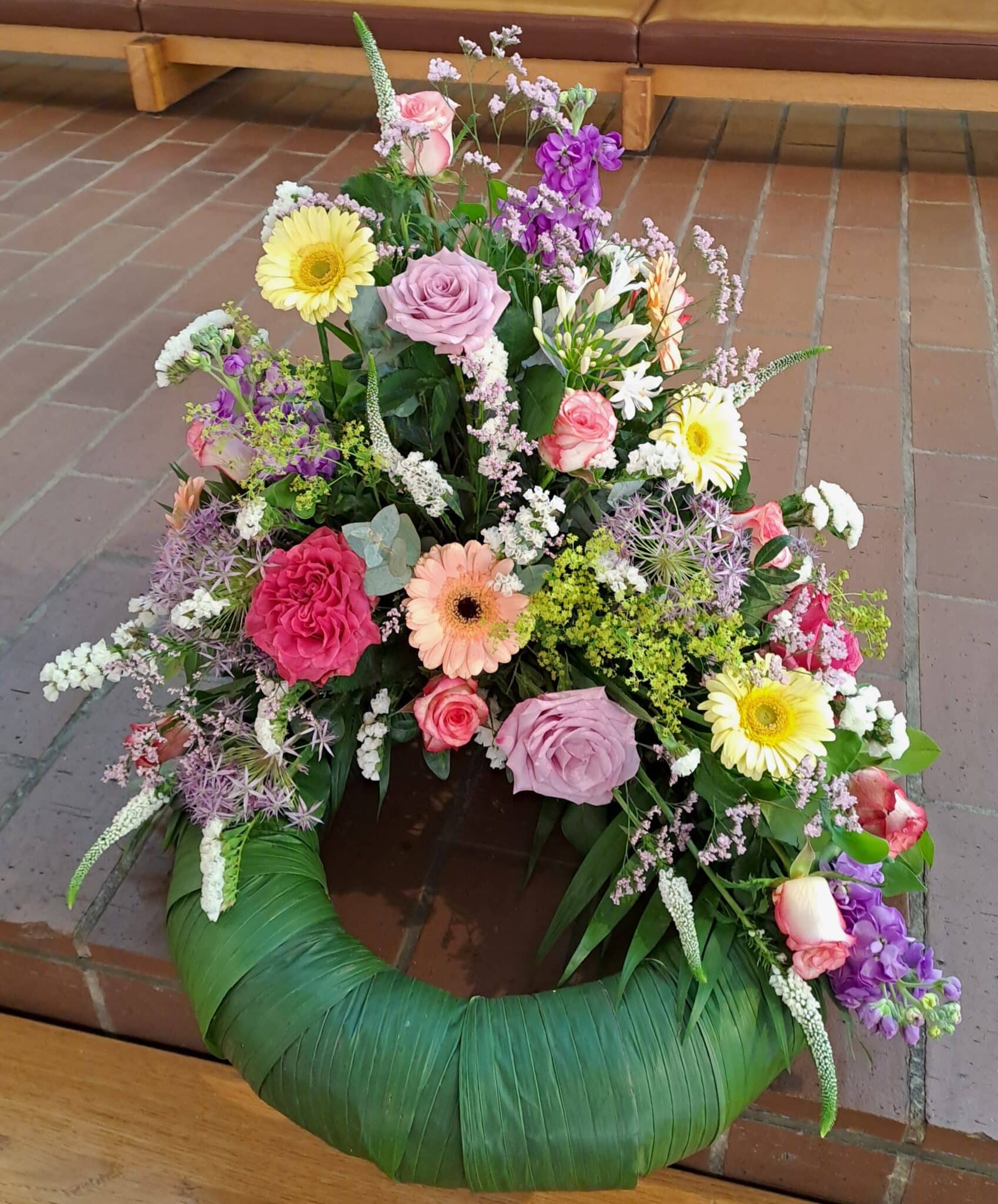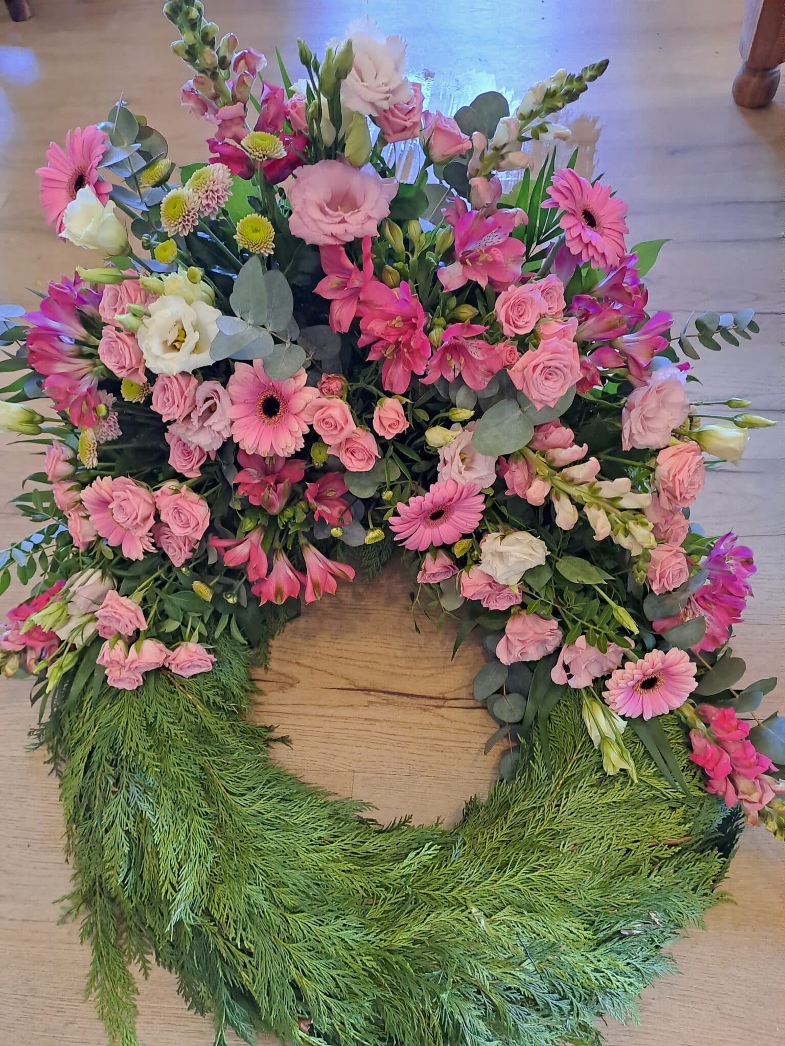 Blomsterdekoratøren udvælger farver og blomster, og skaber en smuk traditionel krans.