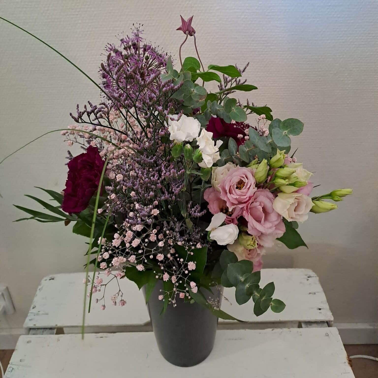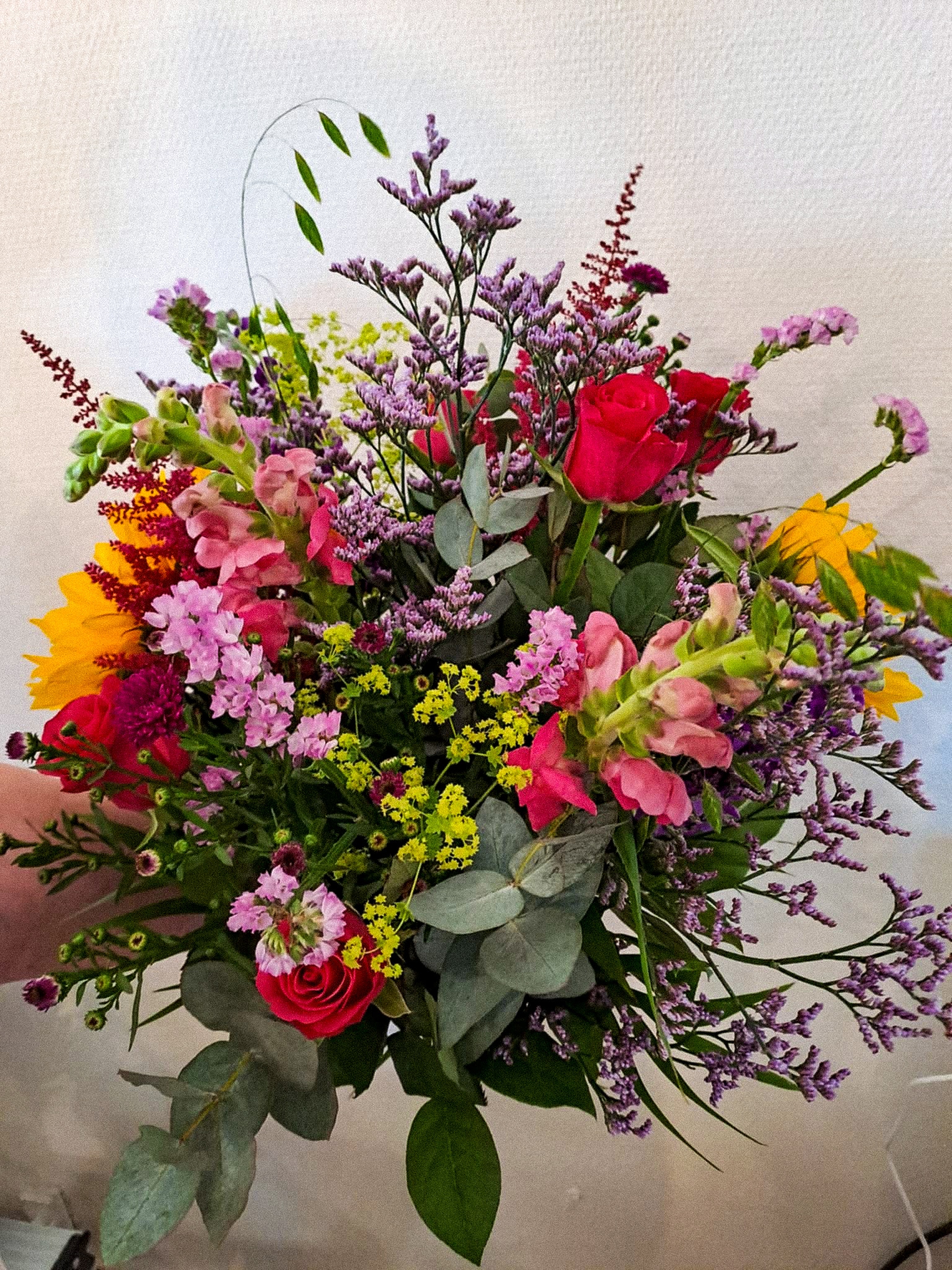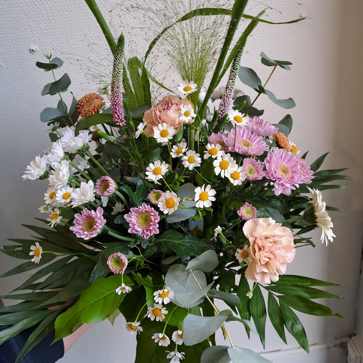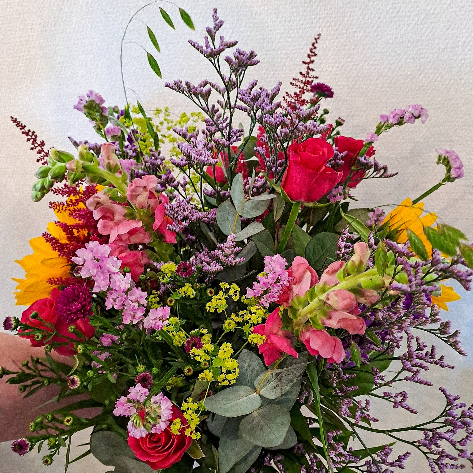 Markbuketten er bundet med blomster som giver et naturligt og vildt udtryk. Blomsterne udstråler at være plukket direkte fra blomsterengen.